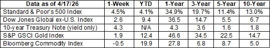 Weekly Market Commentary April 20, 2026 The Markets The market completes a 180. One of the most exciting driving sequences in movies may be the scene from Baby Driver when “Baby” (a reluctant getaway driver) slings a red Subaru into a narrow 180-degree turn, slides backward between obstacles, and immediately pivots into another 180-degree turn, all while perfectly in sync with the beat of his music. Since mid-February, the U.S. stock market has offered a similarly exciting ride. The Standard & Poor’s 500 Index (S&P 500) was closing in on a record high level (7,000) in late February. Then the U.S. military conflict with Iran began and markets drifted lower. The S&P 500 hit bottom in late March when talk of a ceasefire inspired a 180 in outlook and U.S. stocks headed in the other direction. The index recovered lost value incredibly quickly. On Tax Day, it closed above 7,000 for the first time, reported Martin Baccardax of Barron’s. There were three main drivers behind the remarkable recovery. These included: 1) Enthusiasm about the prospect of peace. Investor optimism surged on the possibility of an end to the Middle East conflict. “The stock market has now delivered a year’s return in about two weeks. While that might not be quite as impressive as all summer in a day, it’s been enough to provide a genuine reset for investors. The ‘end’ of the Iran war spurred a market celebration this week, even if the conflict is nowhere near officially over,” reported Teresa Rivas of Barron’s. Over the 12 trading days of April through last Friday, the Nasdaq Composite Index had a double-digit gain, while the S&P 500 was up more than 8 percent, reported Rivas. 2) Excitement – again – about artificial intelligence (AI). Concerns about AI capacity being overbuilt and worries that data centers might not prove profitable, have faded amid rising demand, reported Joe Weisenthal and Tracy Alloway of Bloomberg. “…AI can just do more as the models get better (not just cheaper), and obtain new capabilities, and this improvement should also be seen as a source of new demand. If, for example, [a new AI product] is as amazing at cybersecurity as all the hype says, then I’d expect we’ll see a big surge in AI consumption from people who work on securing computer networks.” Investors’ appetite for AI is reflected in the performance of the S&P 500. Forty percent of its recent gains are owed to five of the biggest tech companies in the index, all are members of the Magnificent Seven, reported Baccardax. 3) A strong start to earnings season. Just 10 percent of the companies in the S&P 500 have reported on their performance during the first quarter. Among that group, more than 80 percent have reported positive revenue and earnings surprises. A positive surprise occurs when a company does better than analysts expected. In the first quarter of 2026, many of the companies that have reported took in more money and were more profitable than analysts anticipated, according to John Butters at FactSet. Last week, major U.S. stock indices finished the week higher. In addition, yields on most maturities of U.S. Treasuries moved lower over the week. |