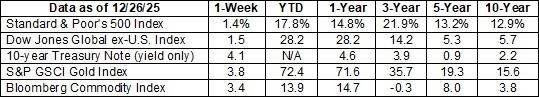 April to June 2025 (the second quarter of the year) · Overall earnings for companies in the S&P 500 grew 11.7 percent. · The Communication Services sector saw earnings grow by 45.6 percent. · The Energy sector saw earnings decline by 18.0 percent. July to September 2025 (the third quarter of the year) · Overall earnings for companies in the S&P 500 grew 13.4 percent. · The Information Technology sector saw earnings grow by 29.2 percent. · The Communication Services sector saw earnings decline by 7.8 percent Companies will begin to report on their 2025 fourth quarter earnings (for October through December) in January 2026. Consumer confidence dipped over the year By December 2025, consumer sentiment was nearly 30 points below the December 2024 level, according to the University of Michigan’s Consumer Confidence Survey. While Michigan’s sentiment index ticked slightly higher from November to December, the Conference Board’s consumer confidence index moved lower. Sabrina Escobar of Barron’s reported: “Consumers are wrapping up the year feeling pretty grinchy about the U.S. economy, with consumer confidence coming in below expectations and marking the fifth consecutive month of declines…The [Conference Board’s] present situation index, which is based on views of current business and labor market conditions, plummeted by 9.5 points to 116.8 in December, reflecting how concerns about the current economy were weighing on consumers. Indeed, on net, people’s views of their current financial situation dipped into negative territory for the first time in nearly four years.” Despite weakening sentiment, consumer spending remained solid Historically, tracking consumer sentiment has been important because it correlated with consumer spending, which is a strong driver of economic growth in the United States. When consumers are pessimistic, spending tends to fall. When they are optimistic, spending tends to rise. In recent years, though, there has been a gap between how consumers feel and how they spend, reported Escobar. That was certainly the case this year. Consumers weren’t happy, but U.S. retail sales (excluding the automotive category) were up 3.9 percent year over year through the holidays. Online sales grew 7.4 percent and in-store sales were up 2.9 percent, according to a payment network’s report. What may be ahead? It’s impossible to predict what will happen in the new year. As we roll into 2026, keep the key principles of investing in mind. You are investing to meet specific financial goals. The chances of meeting those goals are better if you hold a diversified portfolio that aligns with your current circumstances and risk tolerance. While investing, it’s important to keep a long-term perspective. While market downturns can be unnerving, selling out of fear may lock in losses and make it more difficult to reach your long-term goals. Remaining invested and rebalancing the portfolio can be a better idea. The biggest market gains tend to occur in the early stages of a recovery, reported Charles Schwab. Last week, major U.S. stock indexes finished higher, and yields on U.S. Treasuries remained relatively steady. |