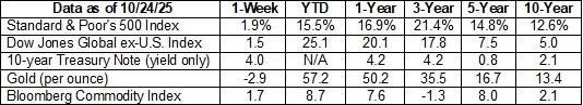 Weekly Market Commentary October 27, 2025 The Markets Stock markets celebrated, but bond markets were cautious. Last week, the Consumer Price Index (CPI) showed that inflation for September was lower than economists had anticipated. Both headline and core inflation (the latter excludes volatile food and energy prices) rose 3.0 percent year over year. “While the September figure is still a full percentage point above the Fed’s 2 [percent] target—and the highest level of inflation seen since January—it signals that the path of price growth is modest enough to allow for additional rate cuts,” reported Megan Leonhardt of Barron’s. Investors had been concerned that a jump in inflation might cause the Federal Reserve (Fed) to stop lowering the federal funds rate. The better-than-expected inflation report gave markets confidence the Fed will continue to lower the fed funds rate this year. Stock markets hit new records Markets rose after the CPI was released. “The Dow Jones Industrial Average closed north of 47,000 for the first time on Friday…The Dow hit its second thousand-point milestone of 2025 after crossing the 46,000 threshold 31 trading days ago, according to Dow Jones Market Data. The S&P also notched its best week since Aug. 8,” reported Connor Smith of Barron’s. United States Treasuries rallied following the inflation news, too, but retreated after S&P Global released the Flash US Composite PMI® Output Index, reported Ye Xie of Bloomberg. The Index provides information about the state of U.S. manufacturing and services. A reading above 50 signals economic expansion, while a number below 50 suggests contraction. In October, the preliminary composite reading was 54.8, a three-month high and well above September’s 53.9 reading. Indexes measuring activity in the manufacturing and services sectors both accelerated from September to October. Faster growth is good news; however, bond investors recognized that it could affect the Fed’s rate-cut decisions. The Fed lowers the federal funds rate to stimulate the economy. If the business activity is growing, stimulus may be unnecessary. Social Security benefits will be higher in 2026 CPI data was calculated, despite the government shutdown, because it is required to determine the cost-of-living increase for Social Security. In 2026, benefits will be 2.8 percent higher, the equivalent of about $56 per month on average, according to the Social Security Administration blog. By the end of the week, major U.S. stock indexes were higher. Yields on many U.S. Treasuries with longer maturities moved higher over the week. |