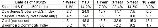 Weekly Market Commentary October 6, 2025 The Markets It was a stellar quarter for investors. The last three months have delivered stock market gains amid signs the economy might not be doing as well as previously thought. Here’s what we saw: Stock markets advanced Solid corporate earnings growth, enthusiasm for artificial intelligence (AI), and expectations for a Federal Reserve (Fed) rate cut helped drive stock markets in the United States higher during the third quarter of 2025. “The broad U.S. equity indices were higher across the board in both September and Q3. For the S&P [Standard & Poor’s] 500 and Nasdaq-100, September marked their 5th and 6th consecutive monthly gains, respectively. And for the S&P 500, this was its 2nd best September…in 27 years,” reported the Nasdaq Market Intelligence Desk Team. Stock valuations moved higher The downside of recent stock market performance is that valuations have reached lofty levels. As a result, investors are paying “the most for future earnings in more than two decades, adding a new element of risk to the market’s rally,” reported Martin Baccardax of Barron’s. The risk is that earnings may not meet investors’ expectations, which could lead to lower stock prices. Questions rose about the strength of the economy Economic data is usually revised several times before the final numbers arrive. In September, the employment report revision showed 911,000 fewer jobs may have been created over the past twelve months than previously thought. The change raised questions about the strength of the economy – and the quality and collection of data for the report, reported Jeff Cox of CNBC. “The revisions were more than 50 [percent] higher than last year’s adjustment and the largest on record going back to 2002. On a monthly basis, they suggest average job growth of 76,000 less than initially reported.” The Fed lowered the federal funds rate Investors have been anticipating a Fed rate cut for some time. In September, the Fed’s concerns about inflation were offset by data suggesting the U.S. labor market is softening rapidly, and the Fed lowered the federal funds rate by one-quarter percentage point. While investors expect more rate cuts this year, it’s unclear whether that will happen. “At the center of the tension are rising prices. While inflation has slowed from its pandemic highs, it remains above the Fed’s 2 [percent] target. Several regional Fed presidents cautioned on Monday that policymakers shouldn’t move too quickly to ease policy, even as investors and Wall Street analysts bet on more cuts,” reported Nicole Goodkind of Barron’s. Consumer sentiment moved lower, too While investors had a lot to celebrate in the third quarter, consumers’ optimism faded in August and September. The University of Michigan’s Consumer Sentiment Index showed that sentiment was down about five percent month over month in September, and more than 21 percent year over year. “Although September’s decline was relatively modest, it was still seen across a broad swath of the population, across groups by age, income, and education, and all five index components. A key exception: sentiment for consumers with larger stock holdings held steady in September, while for those with smaller or no holdings, sentiment decreased,” reported Surveys of Consumers Director Joanne Hsu. The fourth quarter began with a government shutdown. The closure had little effect on market optimism, and major U.S. stock indexes moved higher last week. Yields on U.S. Treasuries generally dipped lower or remained steady over the week. |