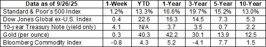 Weekly Market Commentary September 29, 2025 The Markets The economy is all right. Last week, revised economic figures showed the United States economy grew faster from April through June than previously thought. The upward revision was primarily due to a revised estimate for consumer spending over the period, according to Connor Smith of Barron’s. “American consumers, the engine of the world's largest economy, have remained resilient in the face of tariffs and economic uncertainty…The continued strength in spending, which has defied worries about a slowdown, is in contrast to recent data showing a weakening labor market…But initial claims for unemployment insurance fell last week to their lowest level since July…in a sign that the jobs market might not be in as dire shape as other data have suggested,” reported Danielle Kay of the BBC. The contrast between consumer spending and consumer sentiment was striking. Consumer sentiment moved lower again in September and is down more than 21 percent this year, according to the University of Michigan’s Consumer Sentiment Survey. “Nationally, not only did macroeconomic expectations fall, particularly for labor markets and business conditions, but personal expectations did as well, with a softening outlook for [consumers’] own incomes and personal finances. Consumers continue to express frustration over the persistence of high prices, with 44 [percent] spontaneously mentioning that high prices are eroding their personal finances, the highest reading in a year,” wrote Surveys of Consumers Director Joanne Hsu. The inflation picture did not improve in August. Prices, as measured by the personal consumption expenditures price index, were up 2.7 percent year over year. When volatile food and energy prices were excluded, prices rose 2.9 percent year over year. Both measures are well above the Federal Reserve’s two percent inflation target. Last week, major U.S. stock indexes rallied on Friday, but were not able to recoup losses from earlier in the week, reported Sean Conlon of CNBC. Yields moved higher over the week for all but the longest maturities of U.S. Treasuries. |